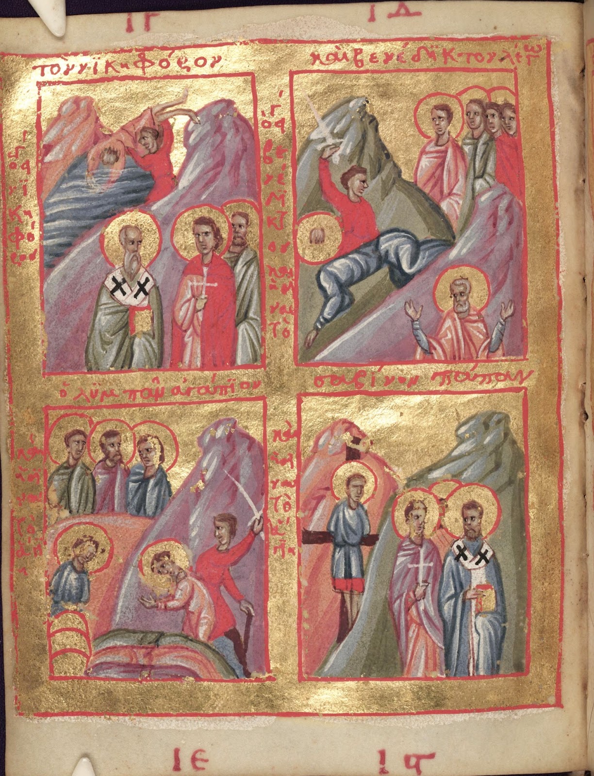 Βυζαντινό Μηνολόγιο τού Μαρτίου (13 - 16) τού 14ου αιώνα μ.Χ. και ευρίσκεται Αγγλία. Βιβλιοθήκη Bodleian στην Οξφόρδη. Αγγλία